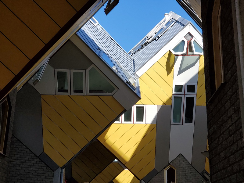 Die Kubushäuser von Piet Bloom gibt es hier seit den 70-ger Jahren. Das Hostel ist in ca. der Hälfte der Kubushäusern.
